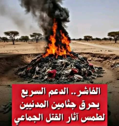 وأوضح أبوبكر أحمد إمام، الناطق الرسمي باسم المقاومة الشعبية بشمال دارفور، أن المليشيا أقدمت على جمع جثامين الشهداء الذين قُتلوا بدمٍ بارد وإلقائهم في الأودية والحفر ثم حرقهم في مشهدٍ “يندى له جبين الإنسانية”، مؤكدًا أن هذا الفعل يمثل “انتهاكًا صارخًا لكل القيم الدينية والأخلاقية والإنسانية”.