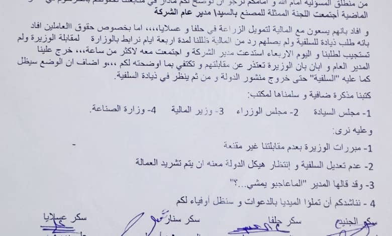 وعبرت اللجنة عن قلقها من أن استمرار الوضع الحالي وعدم تعديل السلفية، بالتزامن مع ما وصفته بـ”انتظار هيكلة الدولة”، قد يقود إلى تشريد العاملين، محذرة من تداعيات ذلك على القطاع ككل.